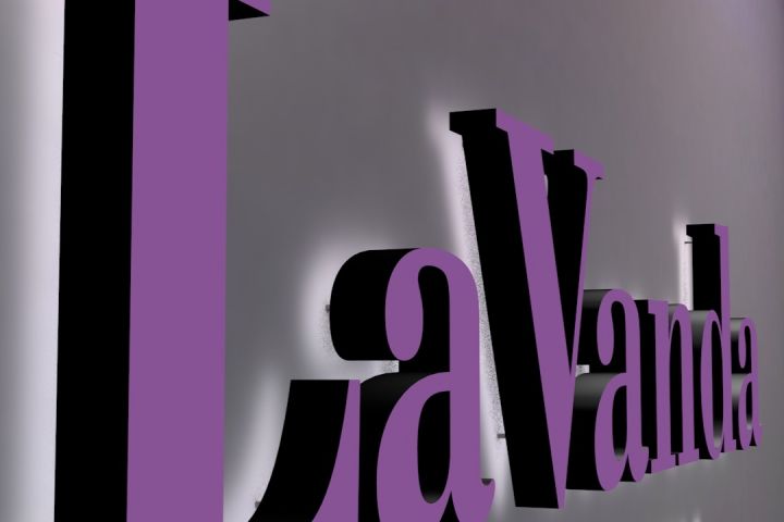 3D-визуализация вывески для салона красоты "LaVanda". Буквы выполнены с элегантным шрифтом и нежным фиолетовым цветом, который подчеркивает утонченность бренда. Контражурная подсветка создает мягкое свечение, добавляющее объем и изысканность. Вывеска закреплена на дистанционных держателях, что усиливает эффект парения на стене. Привязка к интерьеру демонстрирует гармоничное сочетание вывески с дизайном помещения.
