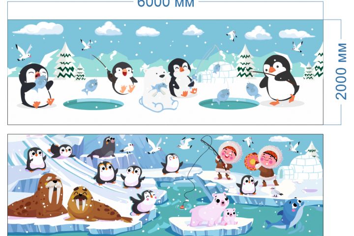 Дизайн зимнего баннера с веселой морской тематикой. Включает ярких пингвинов, занятых зимней рыбалкой возле лунок, ледяные пейзажи с деревьями, снегом и иглу на заднем плане. Атмосфера баннера легкая и игривая, идеально подходит для зимних мероприятий с акцентом на рыбалку.