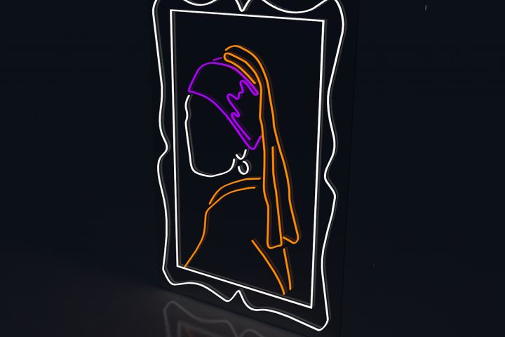 Неоновая стилизация картины "Девушка с жемчужной сережкой", автором которой является Ян Вермеер. Изображение выполнено в минималистичном ключе с использованием контрастных неоновых линий фиолетового, оранжевого и белого цветов, передающих элегантность и таинственность оригинального произведения.