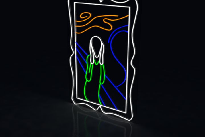 Неоновая интерпретация картины "Крик" Эдварда Мунка выполнена в минималистичном стиле. Основные элементы произведения — фигура в центре и волнообразные линии фона — переданы с помощью ярких неоновых цветов: зеленого, синего и оранжевого, что создает современный взгляд на культовый шедевр.
