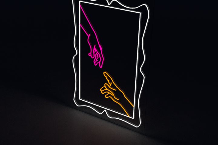 Стилизация неоновой картины вдохновлена мотивом "Адам и Ева", передающим момент взаимодействия через современные минималистичные формы. Две руки, выполненные в ярких неоновых оттенках розового и желтого, символизируют стремление к соединению, а обрамление в виде рамы добавляет глубину и художественный акцент.