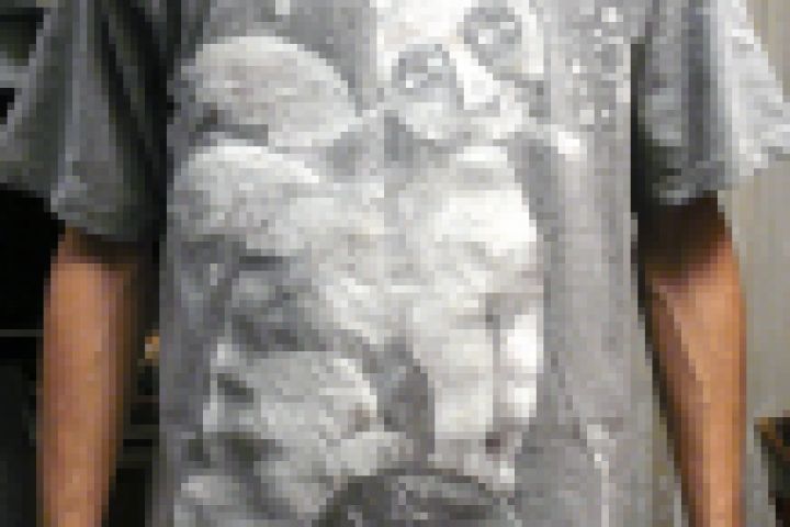 Ручная роспись футболки. Заяц на часах, пускающий из трубки мыльные пузыри