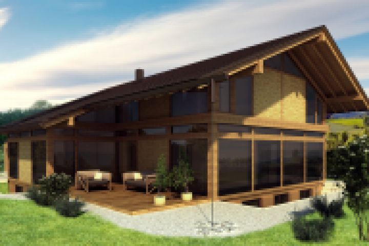 Проектирование и дизайн фасадов деревянного жилого дома. Фасадные панели разработаны специально для этого дома. Заказчик хотел совместить оптику натурального камня и материал дерева.