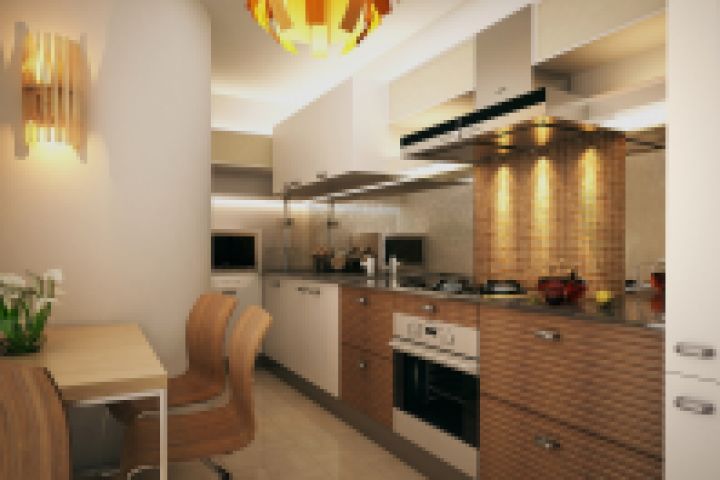 Заданием для дизайнера было визуально расширить маленькую кухню, грамотно расставить функциональную мебель и зоны.
