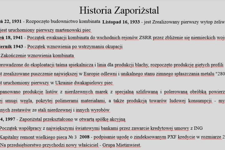 2. Zaporiżstal zaczął swoją historię 22 stycznia 1933 roku. Był zrealizowany pierwszy wytop żeliwa, uruchomiony pierwszy martenowski piec. Dalej była okupacja miasta trwała 2 lata i po wstrzymaniu okupacji było wznowienia kombinata, jego rozwój, różnego rodzaju kryzysy, walka za akcje, za zarządzanie kombinatem.