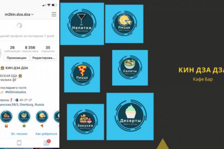 - оформление странцы ( актуальные истории, посты в ленте , меню, афишы в story , шапка профиля )