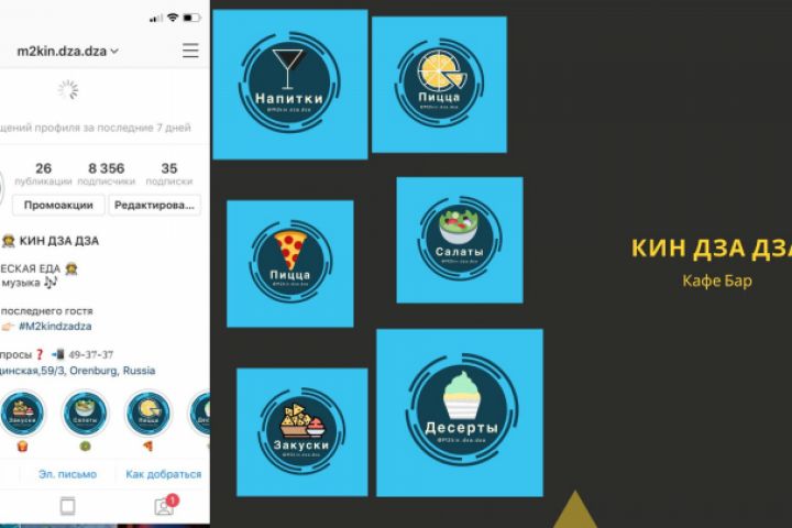 - оформление странцы ( актуальные истории, посты в ленте , меню, афишы в story , шапка профиля )