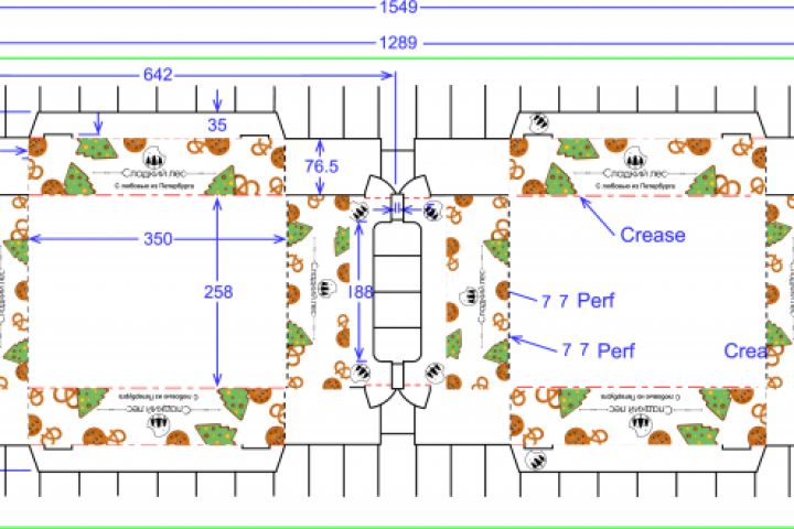Отрисовка в векторе логотипа кондитерской компании и схемы-развертки коробки. Стояла задача отрисовать в векторе логотип и рисунок на панели коробки. Всё это потом следовало разметить на схеме развертки коробки.