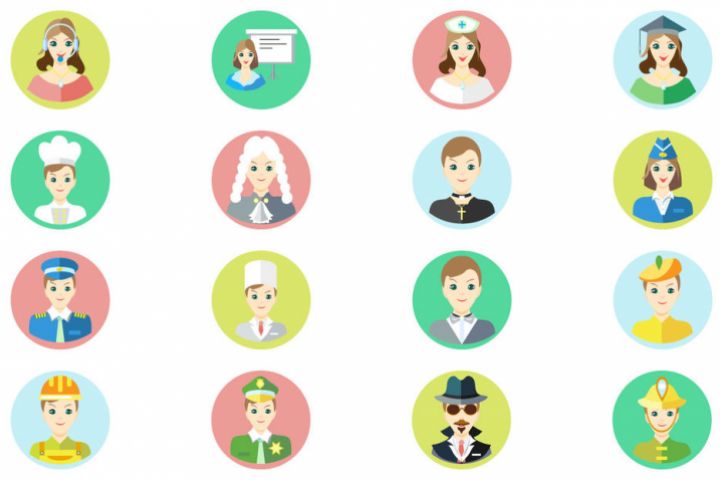 Набор персонажей "люди разных профессий". Векторное изображение. Иконки выполнены в 3 различных вариантах - на круглом цветном фоне, на белом фоне и на темном фоне.