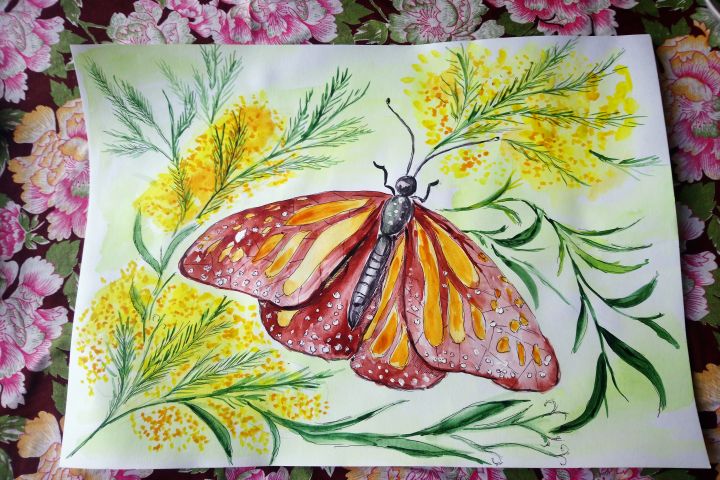 Бабочка на мимозе. Иллюстрация акварелью + линер.