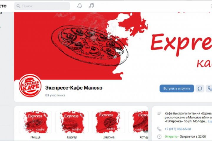 Разработка оформления группы в ВК "Экспресс-кафе Малояз". Рисованная шапка для группы и 10 иконок категорий товаров. Рисунки выполнены от руки с последующим переводом изображения в вектор.