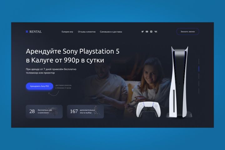 Концепция главного экрана в тёмном цвете для одностраничного сайта.