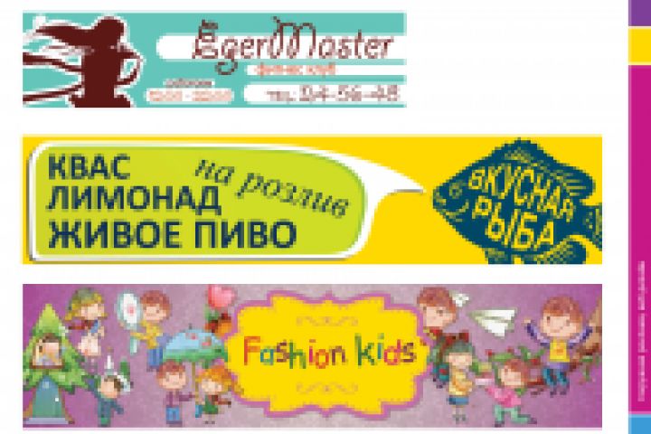 Баннер для фитнес клуба «Eger Master» Вывеска «КВАС, ЛИМОНАД, ЖИВОЕ ПИВО» Баннер для фирмы «Fsshion kids»
