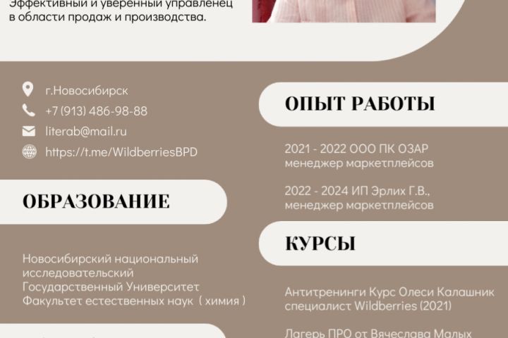 Менеджер-аналитик маркетплейсов Wildberries, Озон, Яндекс маркет, Лэтуаль.Опыт работы 3 года. Большой практический опыт ведения бизнеса,производства,оптовых продаж
