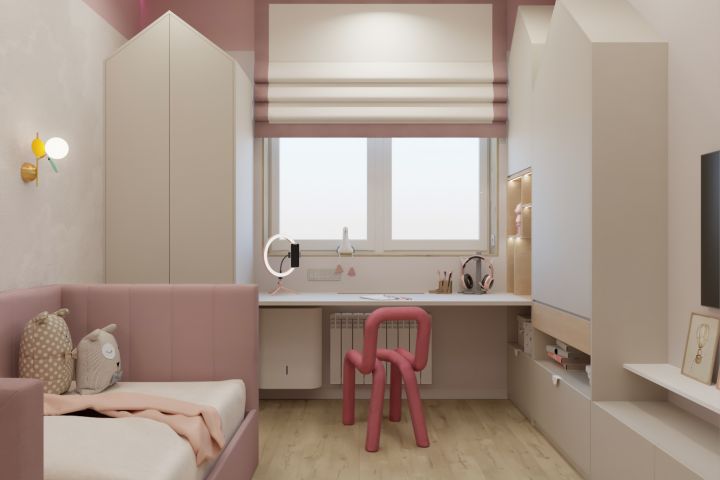 Пожеланием заказчиков было: цвет персиковый, розовый, бежевый. Чтоб было понятно, чья это комната. Так же создать такой дизайн, чтоб можно было легко поменять, когда девочка подрастет.