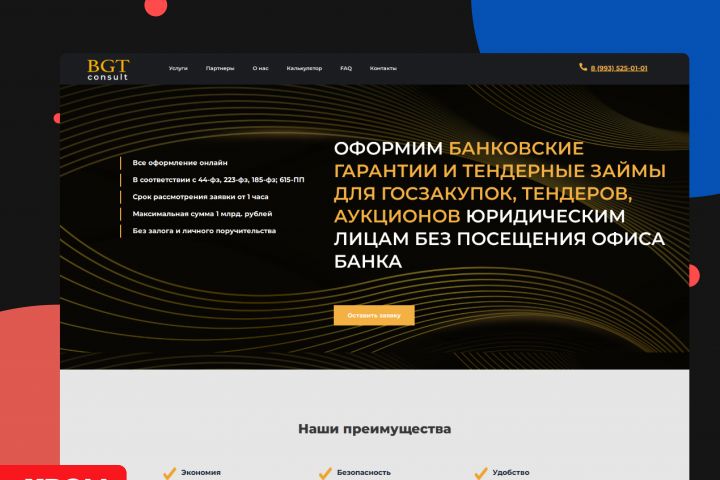 BGT Consult — это специализированный лендинг, посвященный оформлению банковских гарантий и тендерных займов для госзакупок, тендеров и аукционов. Проект разработан для того, чтобы упростить процесс получения финансовых инструментов для юридических лиц, минимизируя необходимость посещения офиса банка и предоставляя клиентам удобный онлайн-сервис.