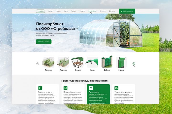 Создать функциональный и информативный интернет-магазин для компании, специализирующейся на продаже поликарбоната. Основная задача — разработать удобный интерфейс, позволяющий клиентам (строительным компаниям, частным мастерам) легко выбирать продукцию по техническим параметрам, сравнивать характеристики и оформлять оптовые заказы.