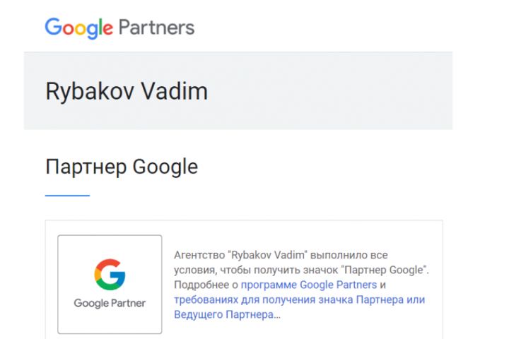 Google Partner Уважаемые клиенты. С 2018 года я имею статус официального партнера Google Рекламы. Это подтверждает мою экспертизу и успешную работу с клиентами Google Рекламы.