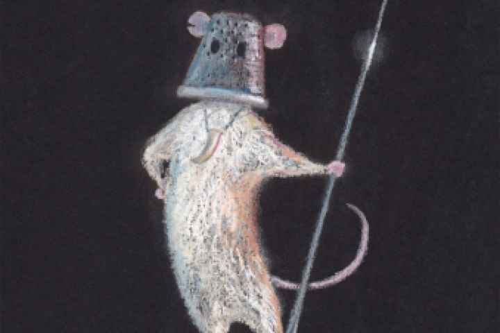 По словосочетанию "шлем" нарисовала мыша - воина в шлеме. Нарисовано пастелью на чёрной бумаге.