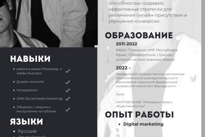Первое Резюме - было выполнено через инструмент "Canva Pro".