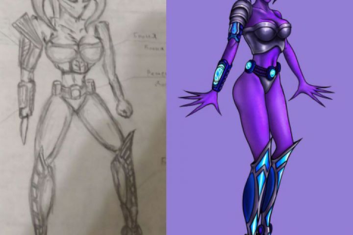 Персонаж по эскизу заказчика, попросил добавить женственности героине и цвета, сохранив общие черты.