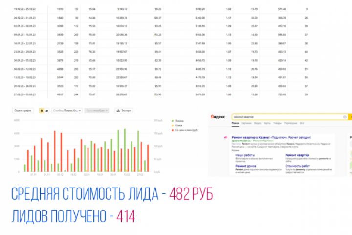 Средняя стоимость лида - 482р Лидов получено 414 Это лучший результат учитывая, что ниша очень грязная со стороны конкурентов.