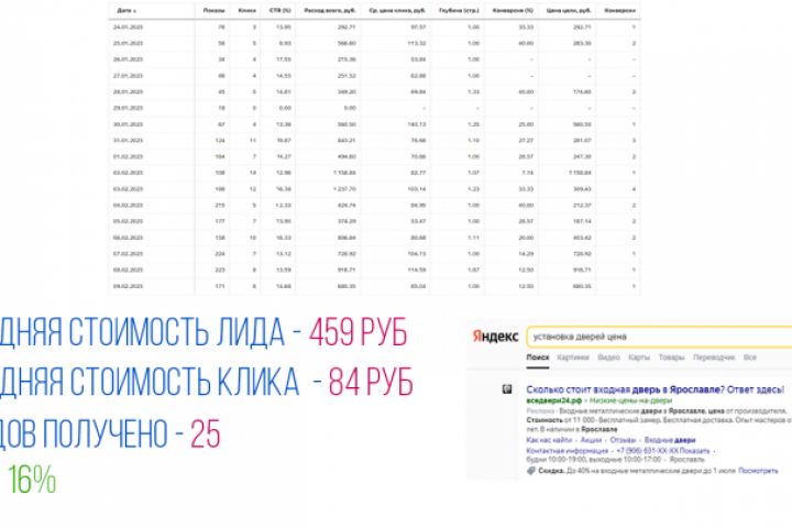 Средняя стоимость лида - 459р Средняя стоимость клика - 84р Лидов получено 25 CTR 16%