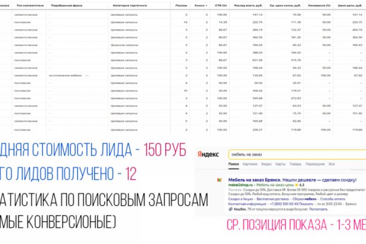 Средняя стоимость лида - 150р Лидов получено 12 Эта статистка по поисковым запросам.