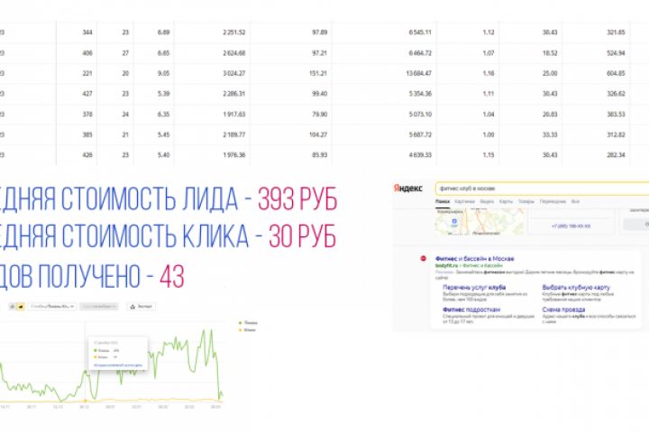 Средняя стоимость лида 393р Средняя стоимость клика 30р Лидов получено 43