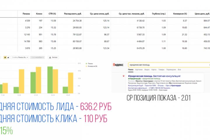 Средняя стоимость лида 636р Средняя стоимость клика 110р CTR 15%