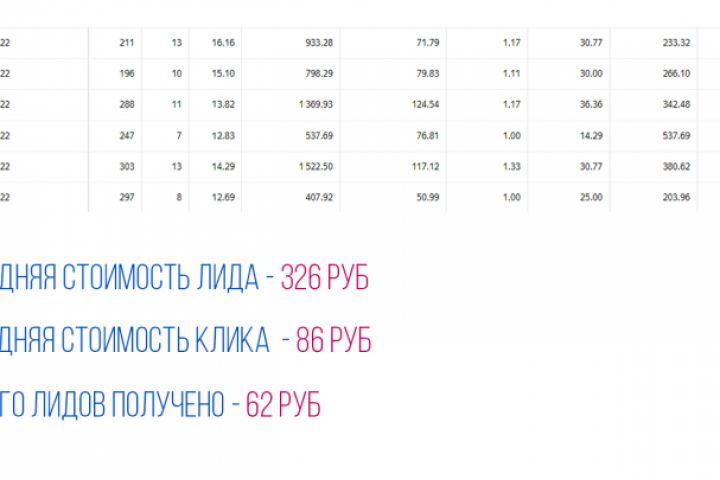 Средняя стоимость лида - 326 руб Средняя стоимость клика - 86 руб Лидов получено - 62 CTR 14.16%