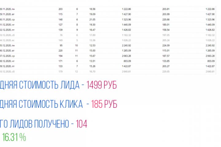 Средняя стоимость лида - 1499 руб Средняя стоимость клика - 185 руб Лидов получено 104 CTR - 16.31%