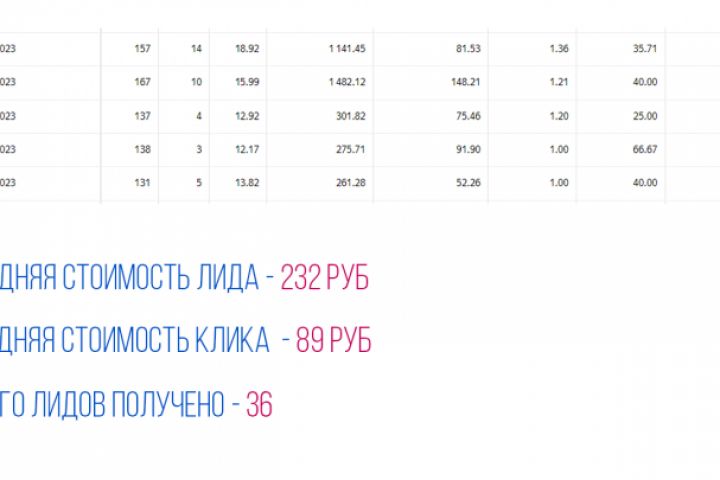 Средняя стоимость лида - 232 руб Средняя стоимость клика - 89 руб Лидов получено 36