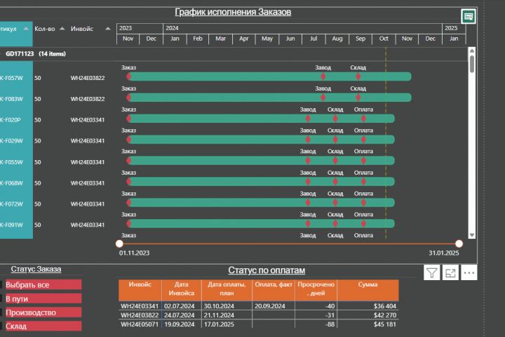 По запросу Заказчика реализована возможность контроля графика исполнения Заказов в Power BI. Данный инструмент дает возможность: 1) отследить статус Заказа, с детализацией до номенклатурных позиций и выставленных инвойсов; 2) видеть продолжительность всей цепочки поставки товара: размещение заказа, цикл производства, длительность доставки, выставления и оплаты инвойса; 3) контролировать своевременную оплату за поставленный товар.