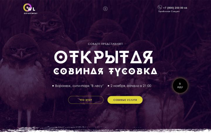 Веб-дизайн лэндинга с креативным замыслом, когда в роли коучей выступают совы, и посадочная страница информирует об открытой совиной тусовке)