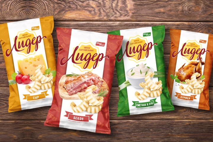 Разработать линейку упаковки для картофельных чипсов ТМ «Лидер» и подготовить к печати
