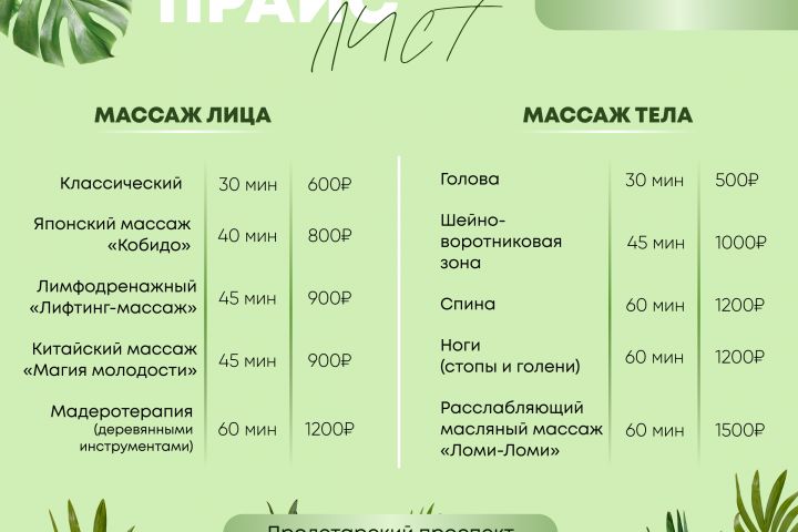 Прайс-лист для массажа