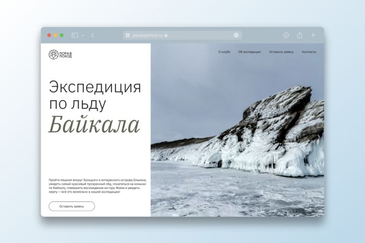 «Пора в поход» — небольшая компания, организующая туры и экспедиции на Байкал. Для нового лендинга требовался современный и информативный дизайн, который передает атмосферу приключений, отражает ценности компании и эффективно привлекает целевую аудиторию.