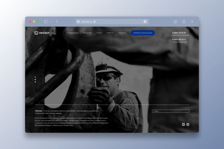 «Пионер» — научно-производственное предприятие, специализирующееся на разработке и выпуске силовых машин. Предыдущий сайт устарел визуально и не учитывал интересы молодой аудитории, поэтому возникла необходимость в его редизайне.