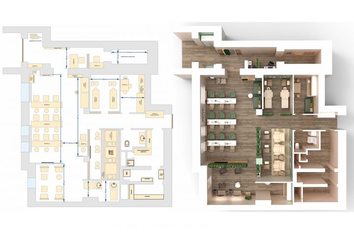 Размеры помещения даны заказчиком. По ним была составлена 2д-схема с расстановкой мебели, учитывая пожелания заказчика. После согласования, отрисован 3д-план помещения в программе Компас 3д, расставлена мебель и наложены текстуры в программе KeyShot. В программе 3ds Max выполнены чертежи недостающих шкафов.