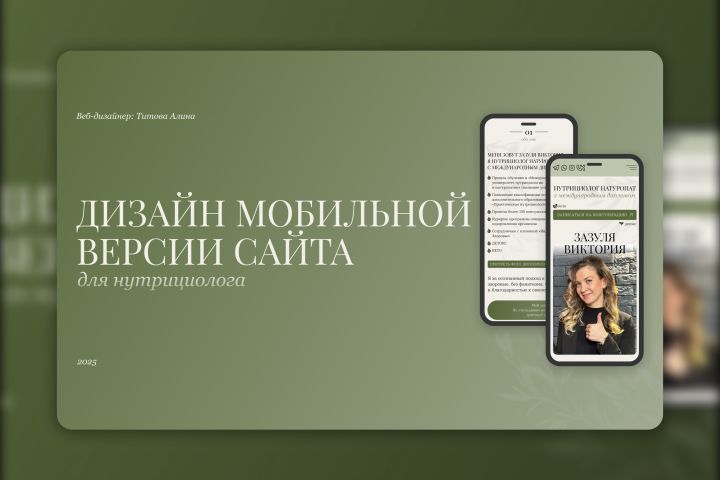 Задача была сделать приятный дизайн мобильной версии сайта для нутрициолога , в зеленых тонах. Десктопная версия не нужна, только мобильная (сайт не будет работать с компьютера). У сайта нет задачи продавать, цель создания сайта- презентация своих услуг