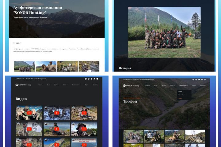 создать сайт визитку для охотников на горных баранов с фотогалереей и видеогалереей и возможностью изменения на несколько языков через плавающую кнопку переключения