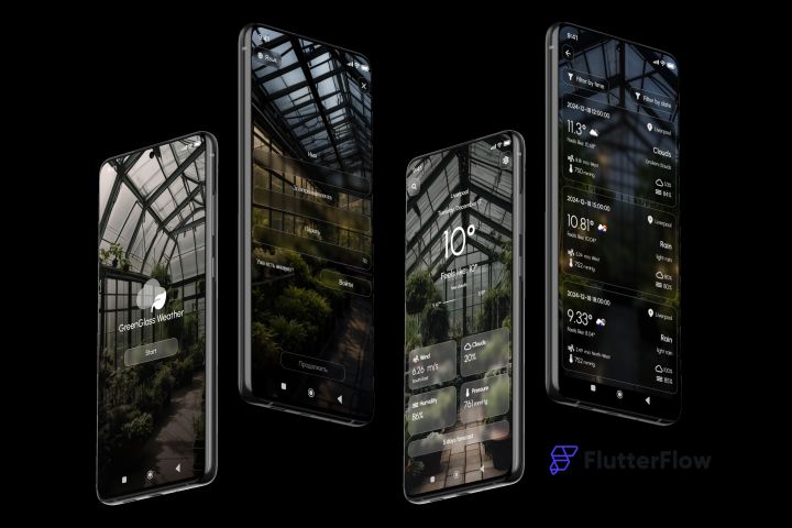 GreenGlass Weather — это мобильное приложение, позволяющее пользователям получать информацию о текущей погоде и прогнозе на 5 дней вперёд с помощью интеграции с API OpenWeather. Пользовательский интерфейс построен с использованием изображений зеленых теплиц и стилизованных под матовое стекло элементов, создавая визуально привлекательный и простой для использования опыт.