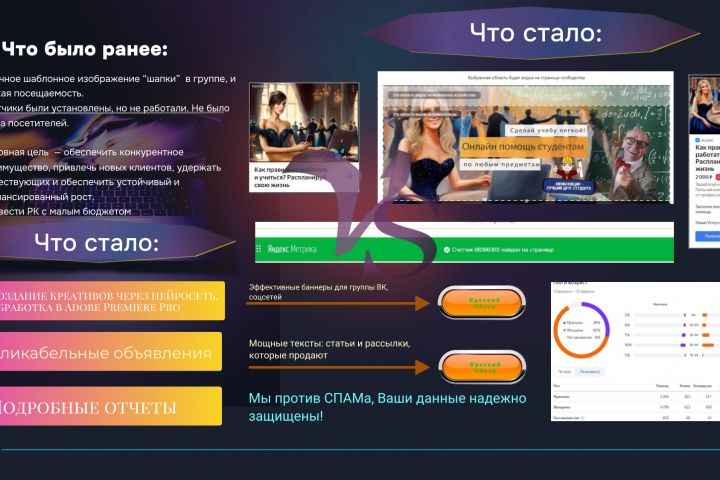 1. **Увеличение трафика**: Количество переходов из Яндекс.Директ в группу ВК увеличилось на 30%, что свидетельствует о высокой заинтересованности пользователей.