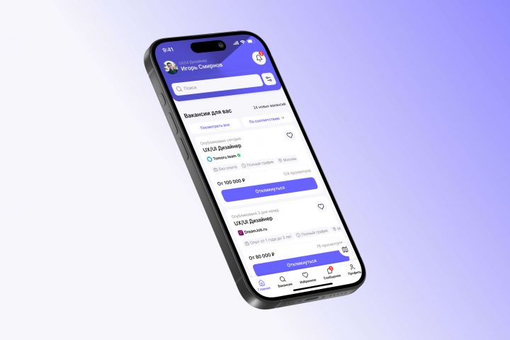 Требовалось разработать мобильное приложение для поиска работы, которое должно было объединить на одном экране несколько функциональных элементов: профиль пользователя, глобальный поиск, фильтрацию вакансий, а также меню и сопутствующие функции. При этом важно было сохранить баланс между функциональностью и удобством использования, не перегружая экран и обеспечив легкость восприятия. Дизайн должен был быть интуитивно понятным, интерактивным, минималистичным и при этом обеспечивать максимально комфортный пользовательский опыт.