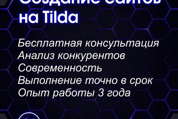 Создать обложку для рекламы бизнеса через интернет. Заголовок: Создание сайтов на " Т I L D E". Написать преимущества: Бесплатная консультация. Анализ конкурентов. Современность. 3 года опыт работы. Работы выполняются качественно, в срок.