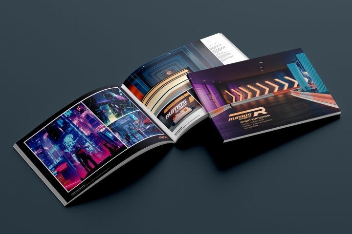 Буклет с презентацией проекта, в котором представлены концепция картодрома, дизайна внутренних помещений и т.д. Дизайн интерьеров оформлен в стилистике ciber-punk.