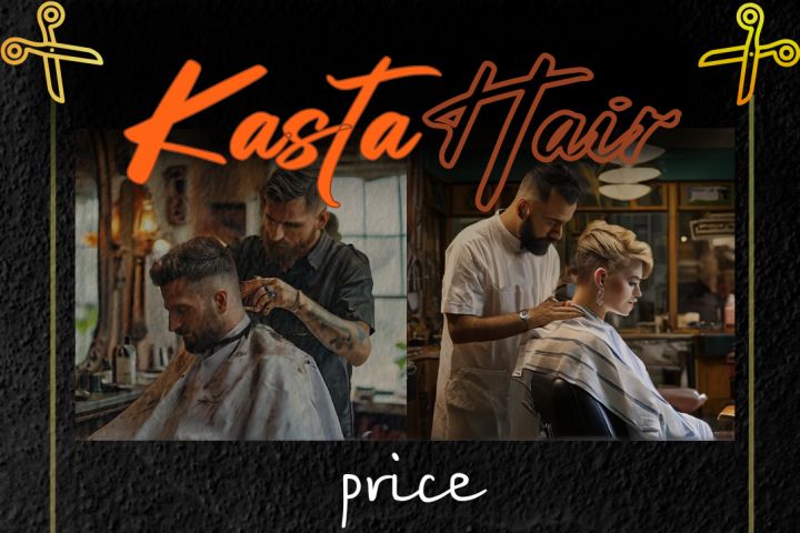 Запрос клиента: «Прайс лист в чёрно-желтых цветах, в каждом углу листа нужны раскрытые ножницы. Вверху листа надпись KastaHair, Kasta-ярко оранжевым, Hair-темным»