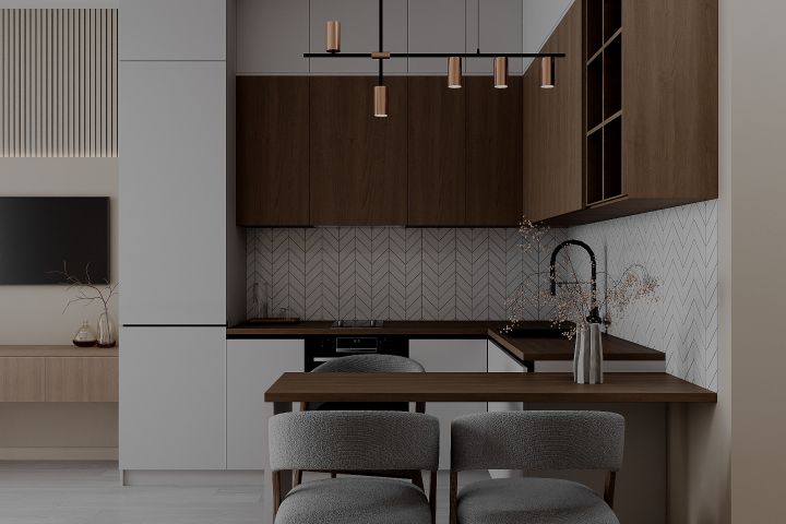 Угловой кухонный гарнитур с объединением обеденной группы. Так же была задача разместить рабочую зону и зону отдыха.»