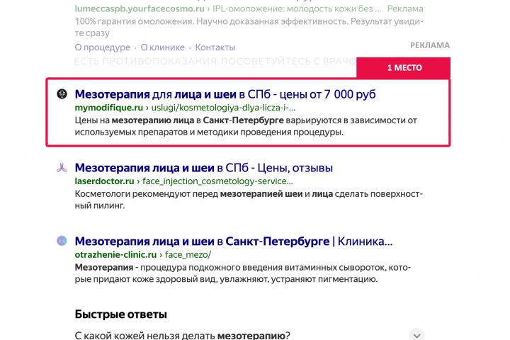 Вывод в ТОП сайта по запросу "Мезотерапия лица и шеи"
